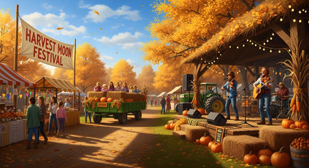 A lively outdoor harvest festival with people gathered around tables of fresh produce and a band performing on stage
