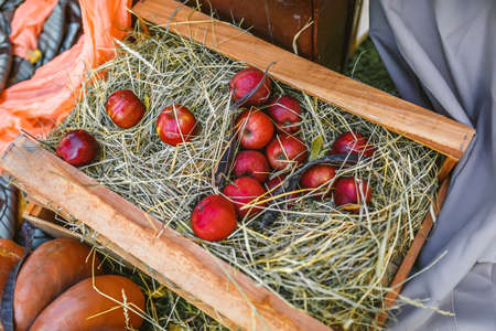 red apples lying in a wooden box filled with hay, against a background of fabrics and pumpkins