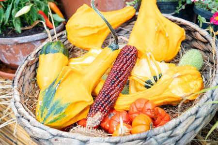 Fall harvest - ripe colorful corn ears in a basket and pumpkins