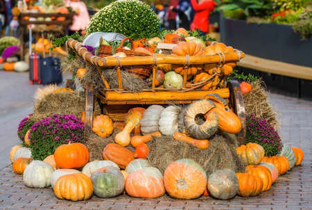 pumpkins in honor of the celebration of autumn and Halloween. festival of vegetables, cart with pumpkins is on the street. the mood of Halloween