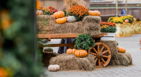 Autumn street design decor of orange pumpkins. Thanksgiving, Halloween. Holiday decoration background with seasonal harvest vegetables, flowers. Outdoor celebration.