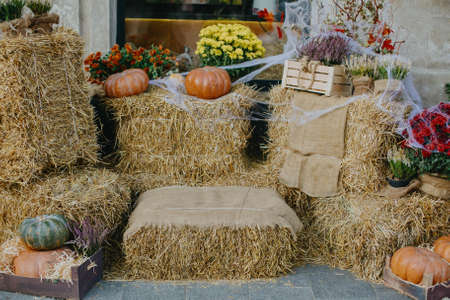 Pumpkins and autumn flowers in cobweb on hay bale, rustic festive decoration of european city street. Halloween street decor. Happy Thanksgiving and Halloween