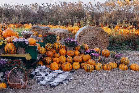 Large, vibrant outdoor display of pumpkins, stacked on a wooden stand and around hay bales, decorated with chrysanthemum flowers for the autumn season. Thanksgiving, Halloween and countryside themes.
