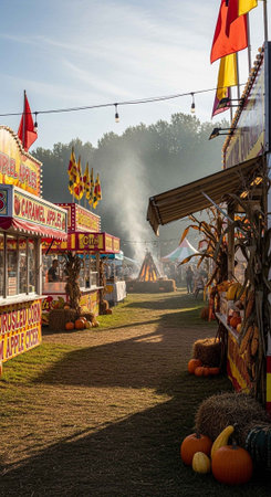 A vibrant autumnal fairground scene with colorful stalls and flags on a sunny day