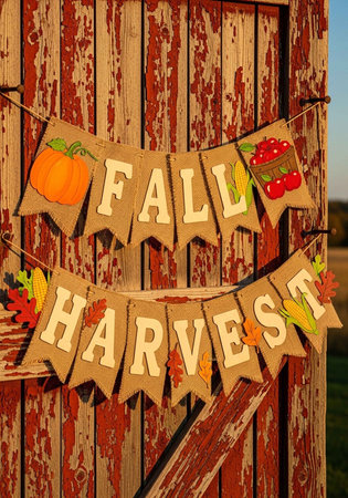 A rustic fall harvest banner hanging on a weathered wooden barn door with a clear blue sky
