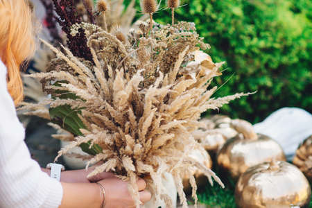 Gold painted pumpkins and flowers for thanksgiving composition. Decorator making luxury autumn holiday decoration. Woman interior designer compose dry flowers and golden pumpkins for house decor.
