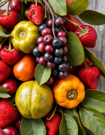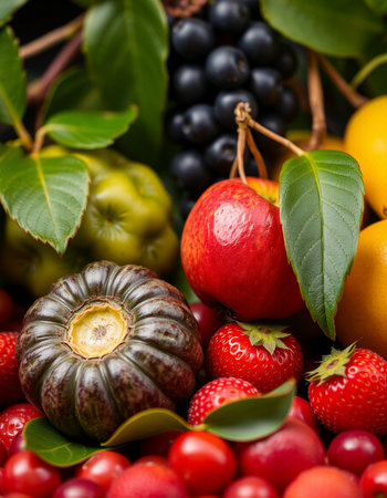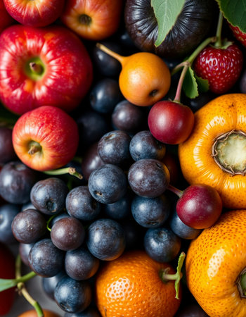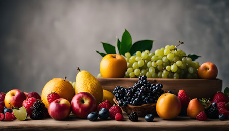 A beautiful and vibrant still life featuring an assortment of fresh fruits and berries, showing the colors and textures of nature's bounty.