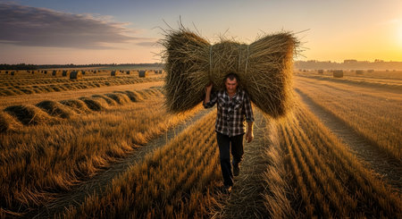 A farmer in a straw hat manually baling hay with a pitchfork and large hay bales scattered across a vast wheat field, showcasing rural agricultural practices.. AI Generation