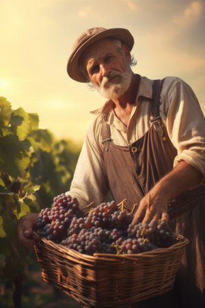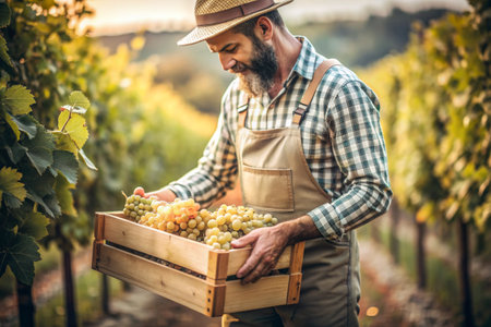 Man harvesting grapes in a vineyard for wine production. Concept Wine production, Grape harvesting, Vineyard work, Farming lifestyle, Agriculture industry