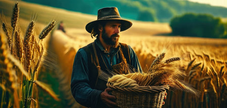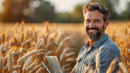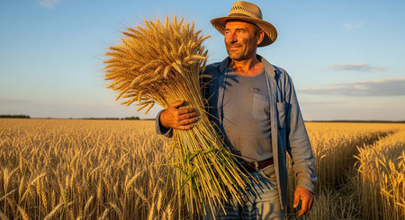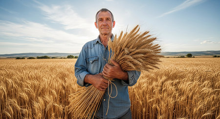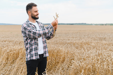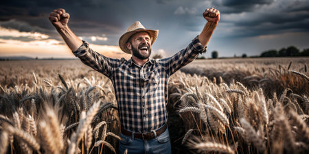 Happy farmer examining ripe wheat ears in a vast field, celebrating a successful harvest season filled with golden crops and growth