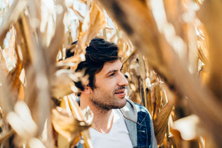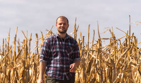 Happy farmer holding basket full of corn cobs in his cultivated cornfield, smiling