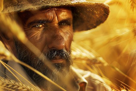 Closeup of a rugged farmers face with intense eyes peering through a wheat field at sunset