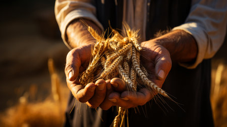 Photo of hands holding grains, focus on the texture and color of wheat with blurred background of farmland. Generated by artificial intelligence.