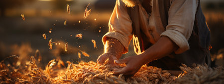 Autumn Farming season. Farmer with harvest on wheat field. Farmer inspecting the harvest. Wheat ready for harvest. Farmer examining harvest. Farmworker walking through the field.