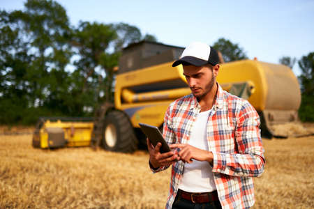 Precision farming. Farmer holding tablet for combine harvester guidance and control with modern automation system. Agronomist using online data management software generating yield maps at wheat field