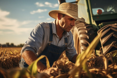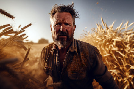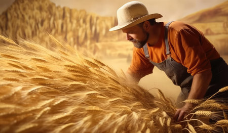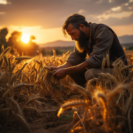 Bearded farmer checking ripe wheat stalks in golden field, ensuring healthy growth and abundant harvest