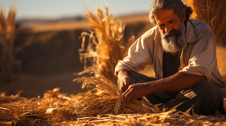 A dedicated elderly farmer carefully inspects his golden wheat harvest under a bright blue sky with fluffy clouds, capturing the essence of agricultural life and hard work.