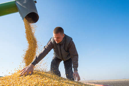Farmer collecting and moving freshly harvested corn kernels in a trailer, illustrating autumn harvest, abundance, and the agricultural process in a rural landscape with colorful seasonal trees