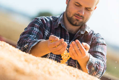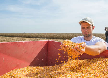 Satisfied senior farmer holding corn crops in tractor trailer during harvest in field