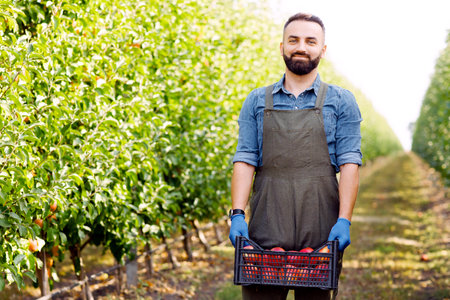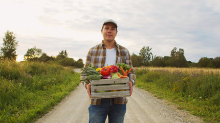 Farmer with a vegetable box in front of a sunset agricultural landscape. Man in a countryside field. Country life, food production, farming and country lifestyle.