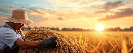 Bathed in golden light, witness Thai farmers harvesting crops in tranquil rice paddies beneath a vibrant sunset This scene captures the essence of rural Thailand, showcasing agricultural life amidst breathtaking natural beauty The perfect blend of hard work, stunning skies, and picturesque landscapes AI Generative