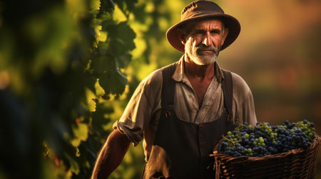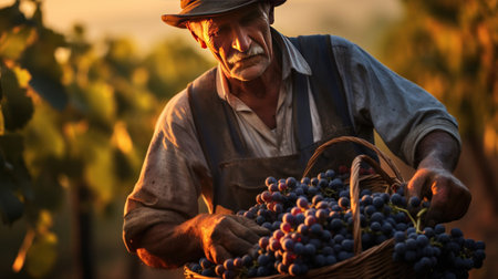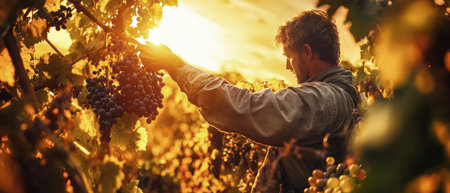 Rustic scene featuring a male farmer harvesting ripe grapes in a vineyard, showcasing the essence of traditional winemaking.