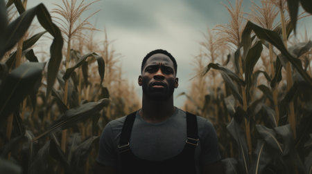 A farmer is depicted tending to crops, bathed in warm sunlight. The image showcases a natural outdoor setting with a focus on agriculture. The composition suggests a sense of hard work and connection to the land, suitable for agricultural or environmental themes. Ideal for commercial applications.