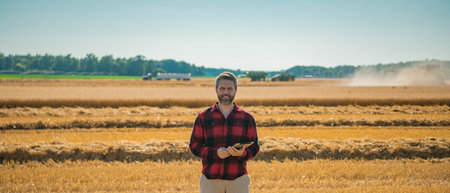 Farmer in the hat checking wheat field progress, holding tablet using internet. digital agriculture.