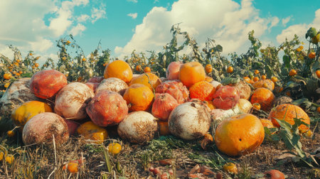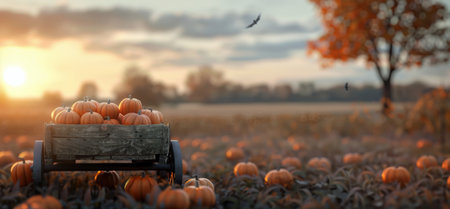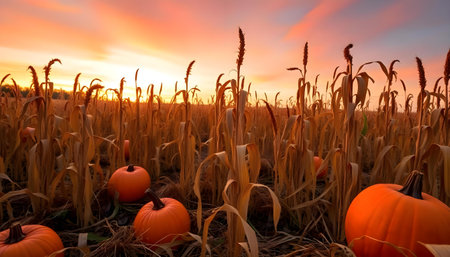 A serene pumpkin patch at sunset with a vibrant orange sky