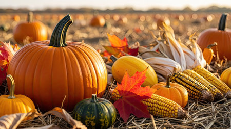 A vibrant illustration of a harvest season scene with pumpkins and autumn leaves in a golden field