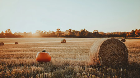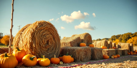 A vibrant autumn scene featuring pumpkins and wheat stalks against a blurred golden background. Perfect for Thanksgiving.