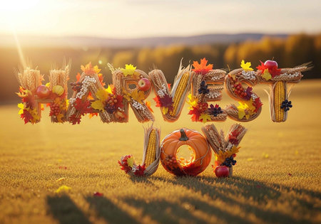 A creative Harvest Joy sign made of corn and leaves in a field at sunset