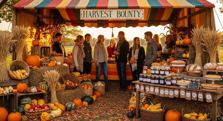 A bustling outdoor harvest market with people shopping for fresh produce and baked goods