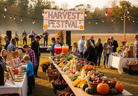A lively outdoor harvest festival with people gathered around tables of fresh produce and a band performing on stage