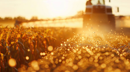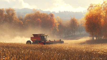 A golden sunset bathes a vast wheat field where a combine harvester works efficiently, evoking themes of abundance and rural serenity.