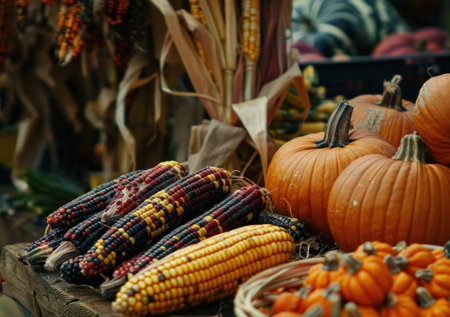 A vibrant display of pumpkins and corn at a rustic autumnal market stand