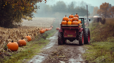 Tractor with pumpkins on a field in autumn. Rural scene.