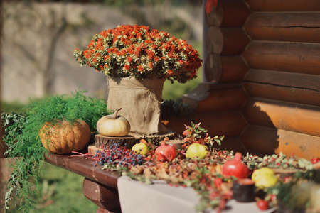 Autumn vegetable harvest and flower arrangement at the farmers market, autumn background
