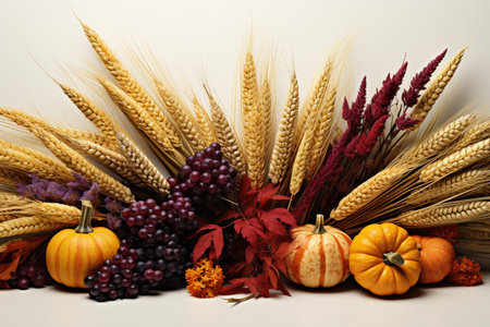 Autumn still life with pumpkins, wheat and berries on white background