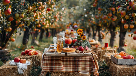 Rustic harvest picnic in apple orchard with hay bale seating, apple pies, and cider