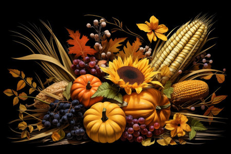 Vibrant harvest holiday with pumpkins, corn, and autumn decorations in a festive setting
