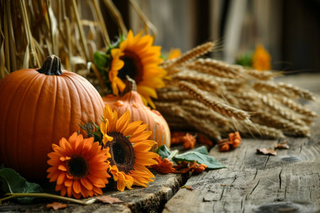 A rustic fall scene with pumpkins, wheat and sunflowers AI generated