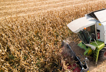 A field of ripe corn with combine harvesters working to collect corn kernels during the harvest season.