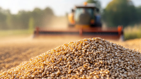 Freshly harvested wheat grains in foreground with combine harvester working in golden field at sunset, showcasing modern agricultural technology.