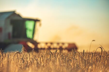 Harvester working in wheatfield at sunset. Harvest ripe wheat. Agriculture and farming