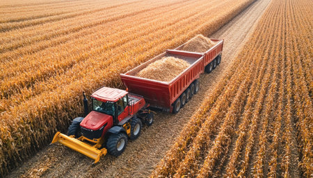 A tractor harvesting corn in a large field, with golden cornstalks and a clear sky in the background.