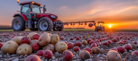 Freshly harvested potatoes in a farm field with tractor under clear sky rural photography
