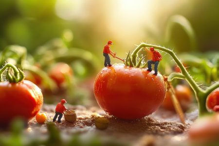 Miniature farmers harvesting giant ripe tomatoes in surreal garden