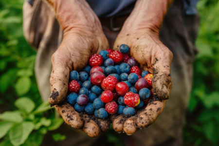Calloused Berries farmer hands. Farmer holding fruits. Generate Ai