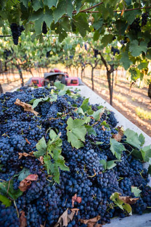 Wine making and winery concept, Fresh grape bunches for making wine, at vineyard